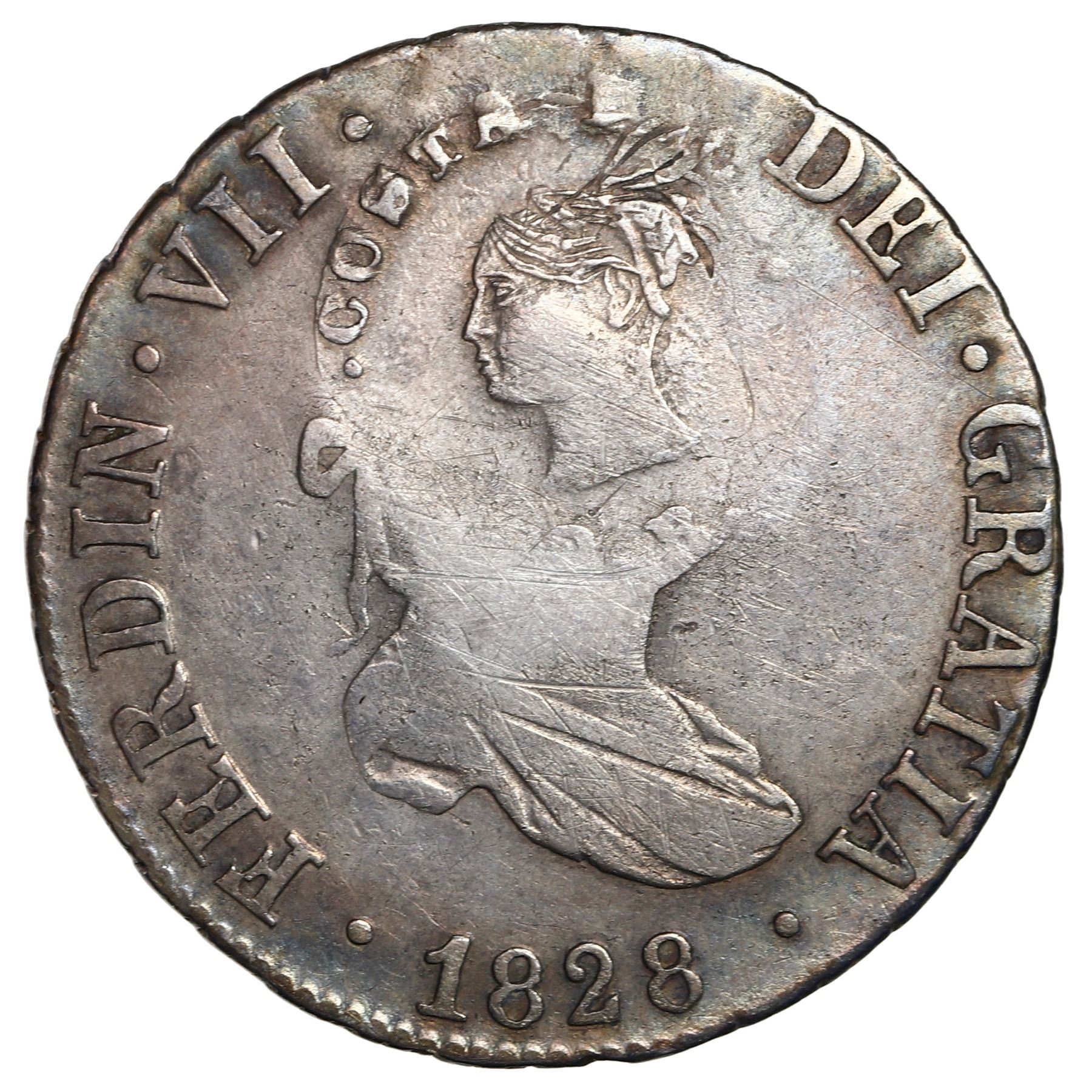 Costa Rica, 2 reales, female head / ceiba tree counterstamp (Type III, 1845) on a Seville, Spain, bust 2 reales, Ferdinand VII, 1828 JB. KM-42. 5.72 grams. XF counterstamp on a VF host with some scratches on the bust, richly toned with blue hues around the rims.