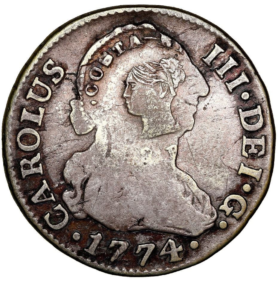 Costa Rica, 2 reales, female head / ceiba tree counterstamp (Type III, 1845) on a Seville, Spain, bust 2 reales, Charles III, 1774 CF, NGC F 15, c/s VF standard. KM-unl (cf 36 for Madrid). Well-detailed host with contrasting toning, the counterstamp with full but weak head and tree, bold COSTA.