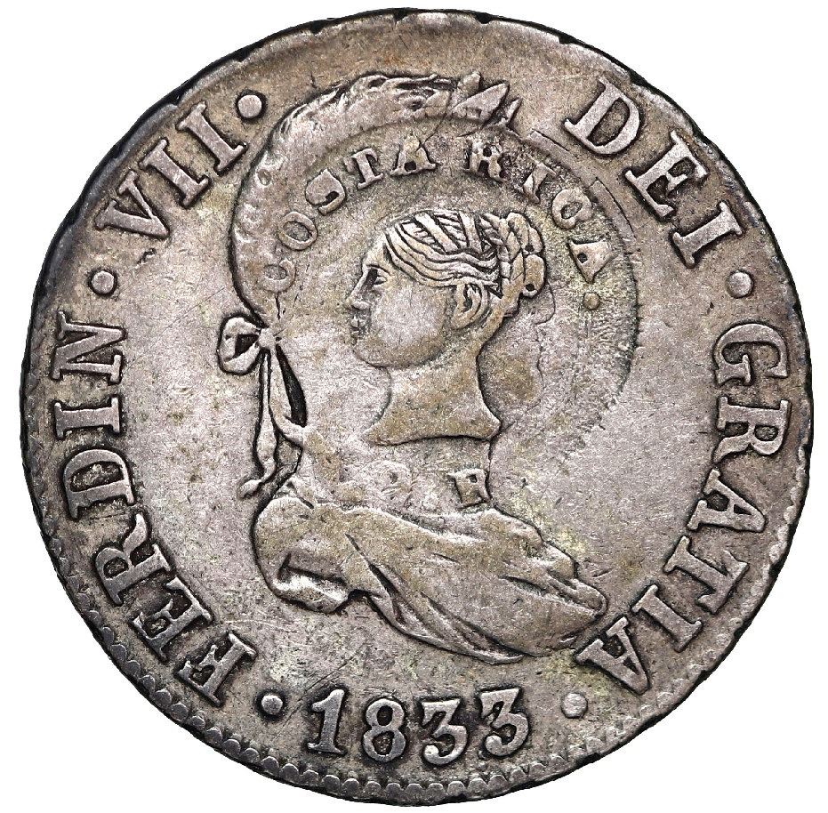 Costa Rica, 2 reales, female head / ceiba tree counterstamp (Type III, 1845) on a Seville, Spain, bust 2 reales, Ferdinand VII, 1833 JB, NGC VF 20, c/s VF strong. KM-42. With light steely toning over muted luster and full details on both the host and counterstamp, this choice example is tied for second finest in the NGC census behind a single AU 55, among currently 43 entries.