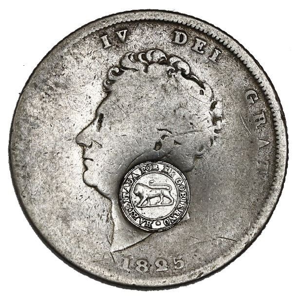 Costa Rica, 2 reales, "lion" countermark (Type VI, 1849-57) on a Great Britain shilling, George IV, 1825. KM-95. 5.08 grams. Bold and deep XF countermark on an AG host with some small scratches above the lion, mostly non-toned.