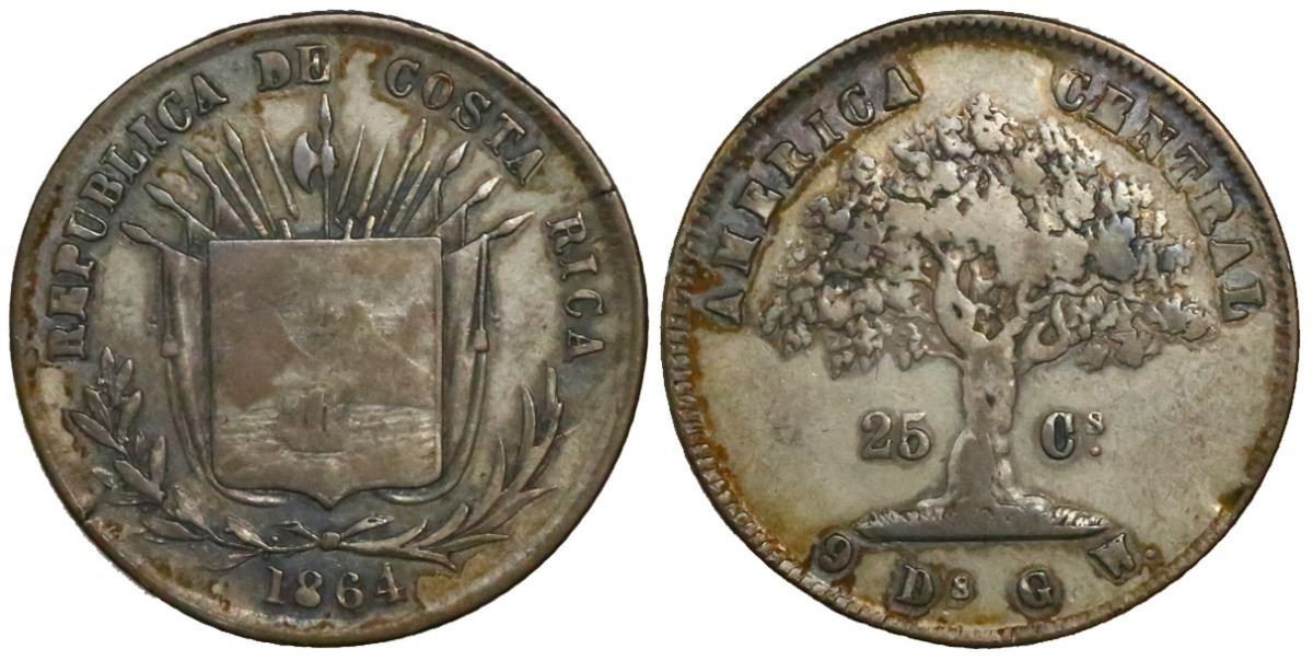 Costa Rica, 25 centavos, 1864GW, denomination in small digits, ex-Mayer. KM-105. 6.11 grams. One-year type, AVF with toning around details. Pedigreed to Fred Mayer collection.