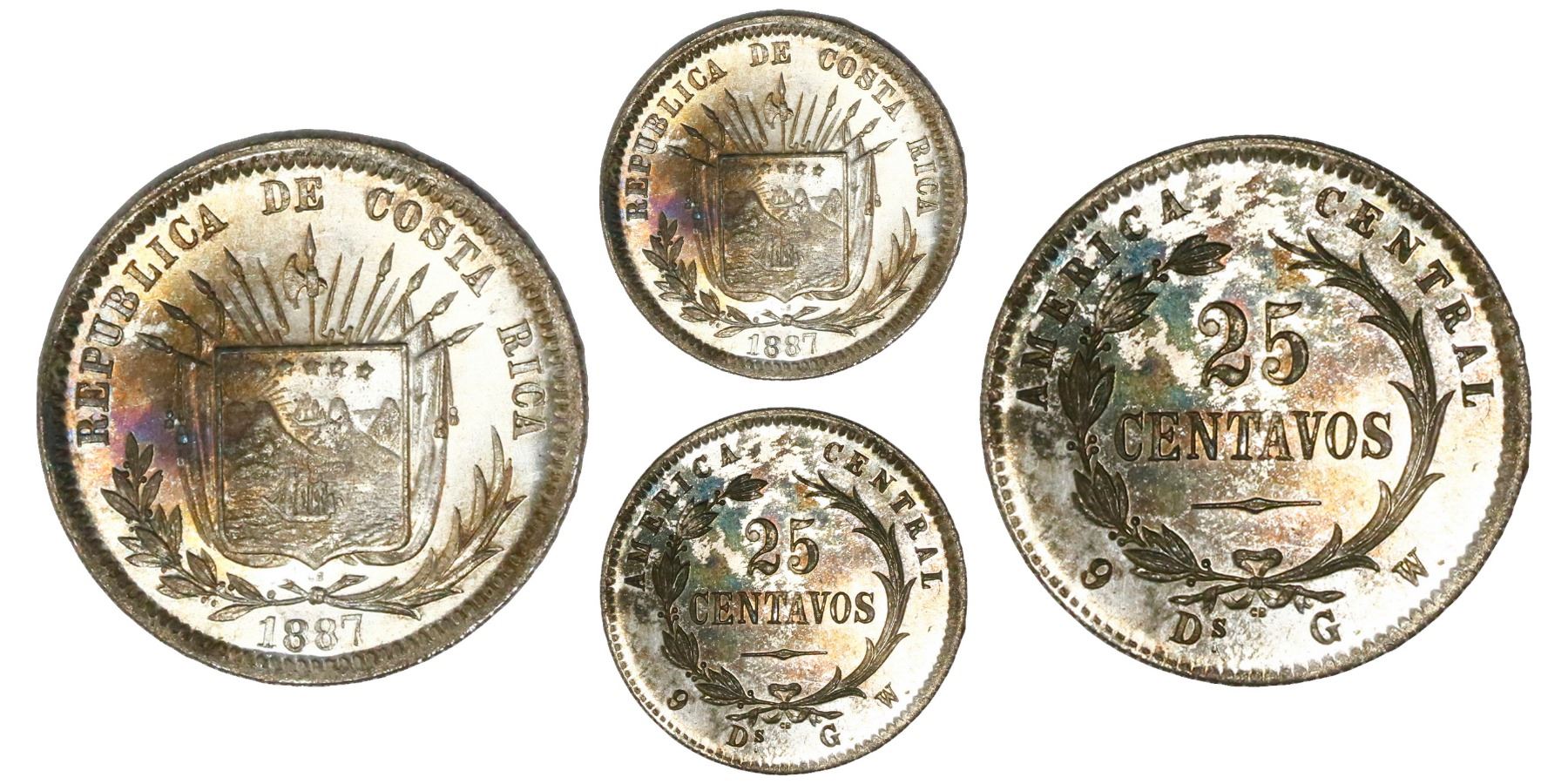 Costa Rica, 25 centavos, 1887GW, "9DS GW," NGC MS 66, finest known in NGC census. KM-127.2. Brightly lustrous with patchy colorful toning, no wear or marks, the finest at NGC by two grades, and actually with claims to a higher number in our opinion, quite exceptional for local (non-Heaton) production in San Jose, of which this is effectively the final year (the only exception being the enigmatically relatively common half dollars of 1890). By this date the government in San Jose decided it would be more cost effective to order the coins from England or Paris (or other mints) than to replace the aging local minting equipment. In 1889, while local merchants made do with counterstamped Colombian half dollars, the first European issues were struck, starting with the Heaton mint "patterns" that are more correctly known now as "specimens." In any case, we challenge anyone to show us another MS 66 from the 1865-1887 San Jose coinage! NGC #4700529-013.