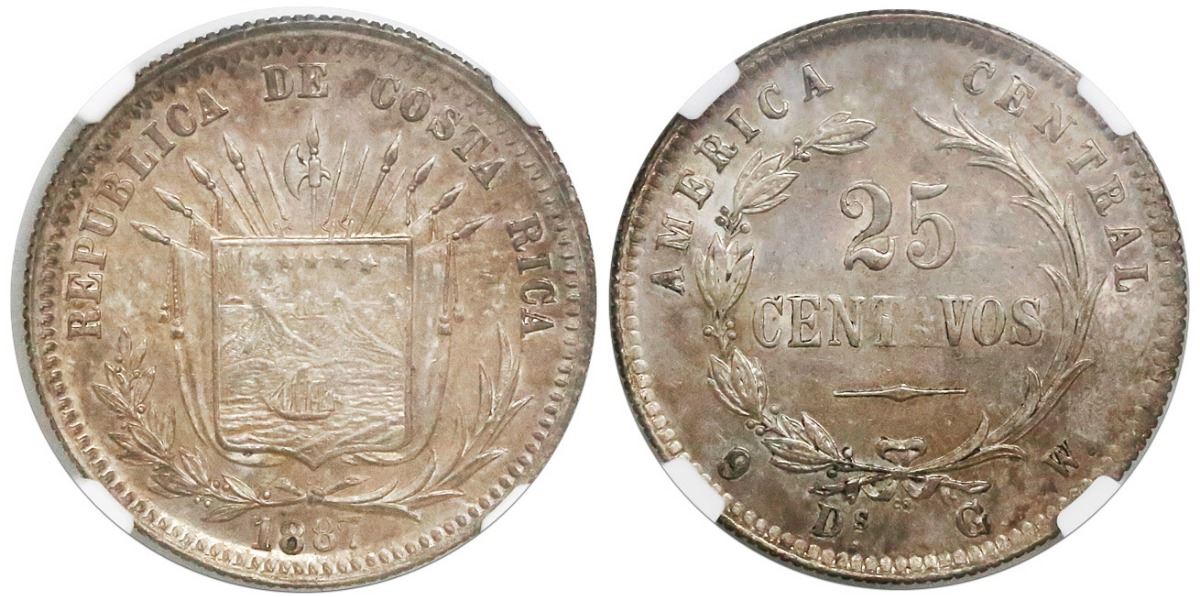Costa Rica, 25 centavos, 1887GW,  9DS GW  variety, encapsulated NGC MS 63.