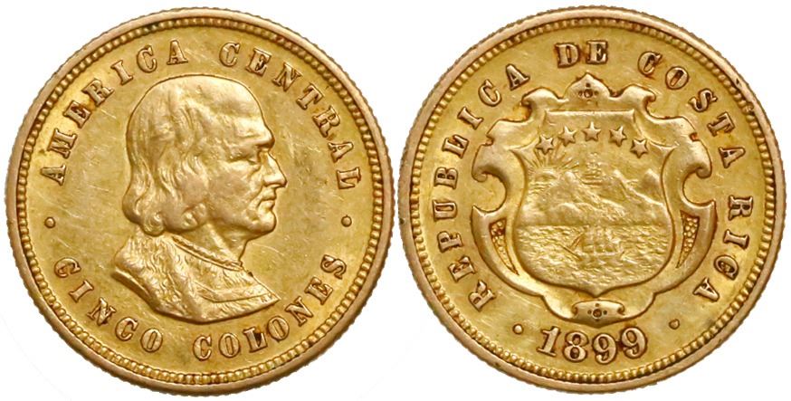 Costa Rica, 5 colones, 1899. KM-142. 3.88 grams. AU, light marks.
