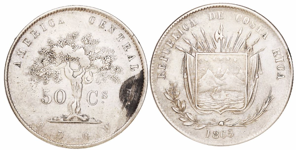 Costa Rica, 50 centavos, 1865GW. 12.57 grams. XF+ with spot of black toning to right of tree.