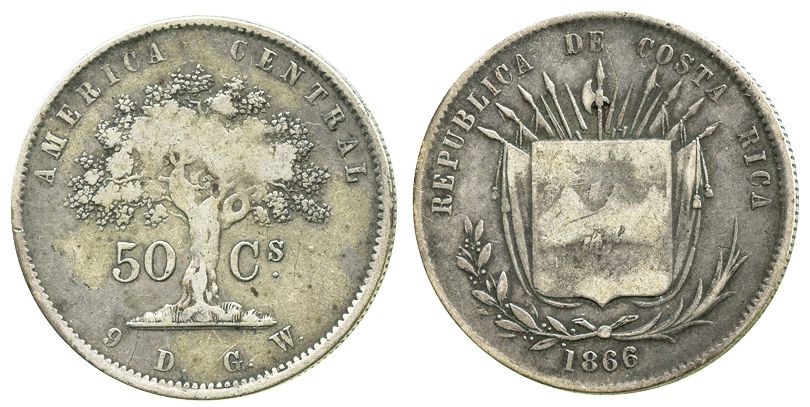 Costa Rica, 50 centavos, 1866/5GW. KM-112. 12.5 grams. Toned Fine with typically weak centers, no problems, scarce overdate. Pedigreed to our Auction #7, with lot-tag #1376.