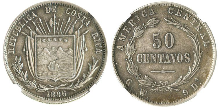Costa Rica, 50 centavos, 1886GW, encapsulated NGC AU 55, finest known graded by NGC.