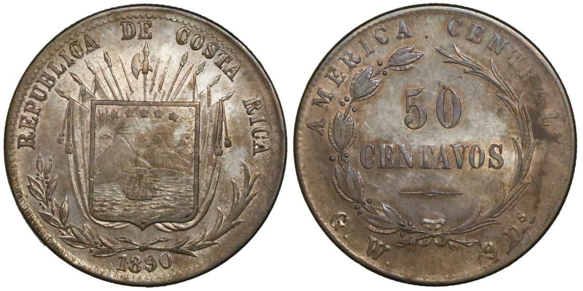 Costa Rica, 50 centavos, 1890GW KM-124. 12.65 grams. Very choice UNC with luster and attractive, light rose toning.