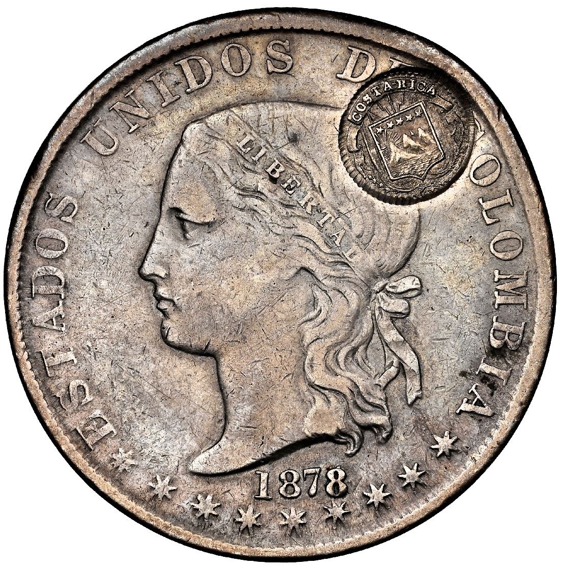 Costa Rica, 50 centavos, arms/lion double countermark (Type VII, 1889) on a Medellin, Colombia, 5 decimos, 1878/4, XF details / cleaned, AU strong, ex-von Schuckmann. KM-135.2. Light toning that is darker in the full and deeply impressed countermarks, scarce host with clear overdate, desirable pedigree. Pedigreed to the Siegfried von Schuckmann Collection (Renaissance auction of December 2000, with original lot-tag 754).