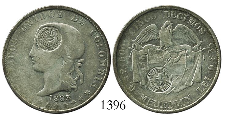 Costa Rica, 50 centavos counterstamp (Type VII, 1889) on Medellin, Colombia, 5 decimos of 1883.