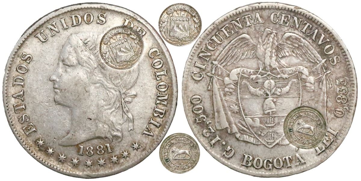 Costa Rica, 50 centavos, lion counterstamp (Type VII, 1889) on a Bogota, Colombia, 50 centavos, 1881