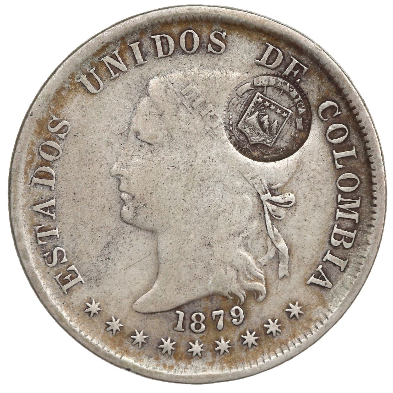 Costa Rica, 50 centavos, "lion" double countermark (Type VII, 1889), on a Bogota, Colombia, 50 centavos, 1879. KM-134.1. 12.28 grams. VF double countermark on a VF host coin, gray-toned surfaces with some rainbow hues.