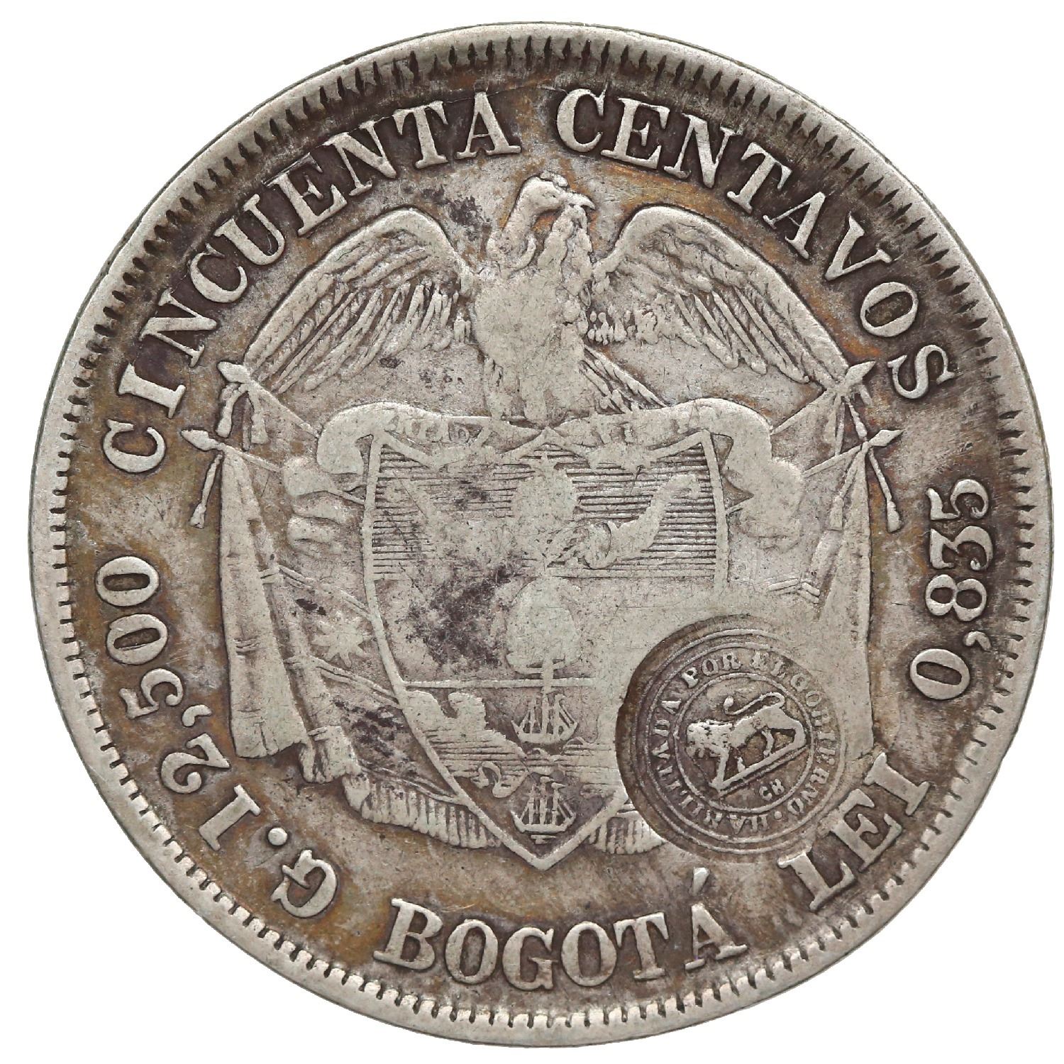 Costa Rica, 50 centavos,  lion  double countermark (Type VII, 1889), on a Bogota, Colombia, 50 centa