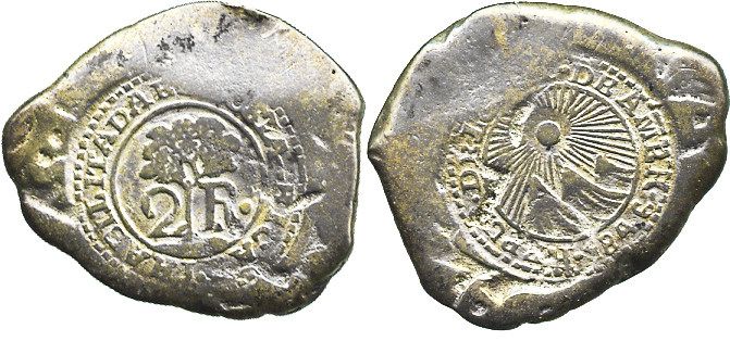 Costa Rica, Central America Republic, 2 reales, 1846JB, Type V counterstamp on a Potosi, Bolivia, cob 2 reales, 176(?). 4.2 grams. Nearly full counterstamp (VF+) on a typically worn host (VG) with partial date near edge (probably 1764), lightly toned.