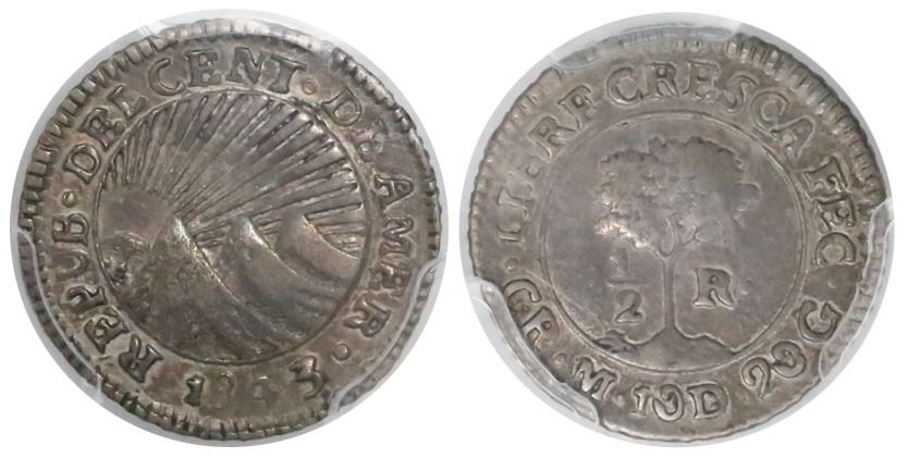 Costa Rica (Central American Republic), 1/2 real, 1843M, encapsulated PCGS XF 40, finest and only sp