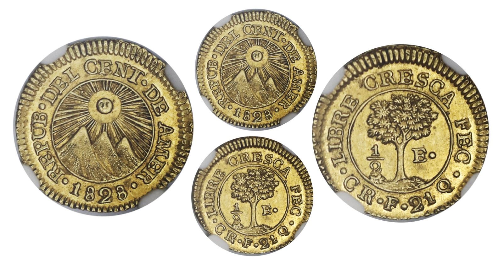 Costa Rica (Central American Republic), gold 1/2 escudo, 1828F, NGC AU 58. KM-80 (under Central American Republic). Bold strike and choice satin-smooth fields with decent luster, prominent rims despite slightly off-center strike, should be Mint State in our opinion. NGC #3477905-001.