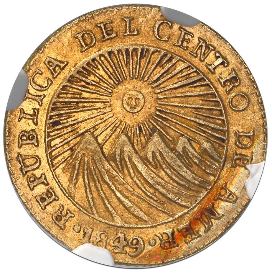 Costa Rica (Central American Republic), gold 1 escudo, 1849 JB, NGC AU 58. KM-14. Sharp and fully detailed strike, strong luster overlain with a light streak of red across AMER, popular type that is somewhat rare without a lion countermark for Costa Rica as its own republic.