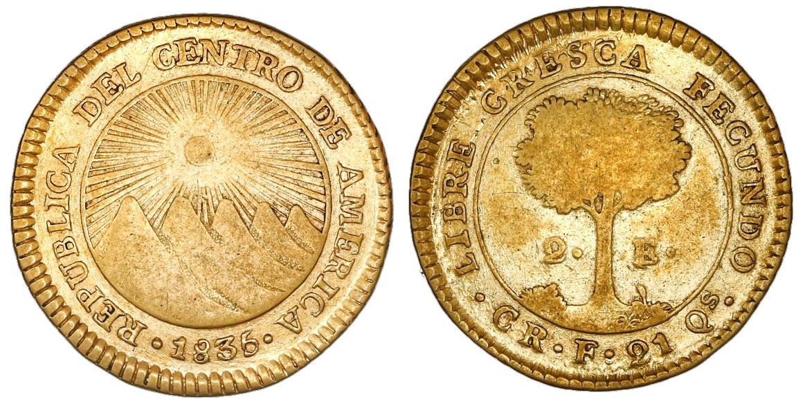 Costa Rica (Central American Republic), gold 2 escudos, 1835F, NGC VF 30. KM-15 (under Central American Republic). Bold legends but weak interiors as usual, light color and luster. NGC #4772354-003.