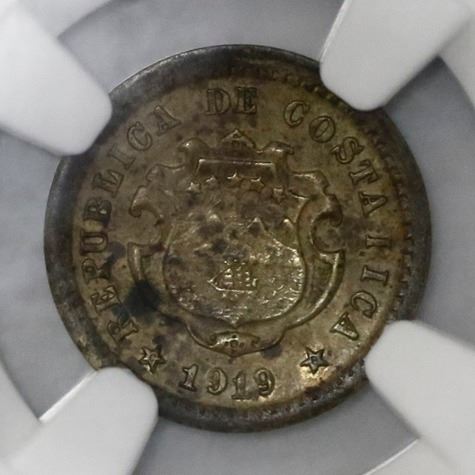 Costa Rica, brass 5 centavos, 1919GCR, NGC AU 55. KM-149.2. Crudely struck with weak rims and slight cup shape (typical for this date), spotty and streaky dark toning, rather scarce date. NGC #4700529-012.