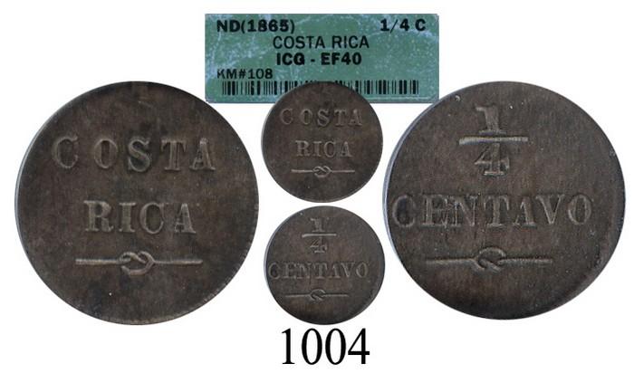 Costa Rica, copper-nickel ¼ centavo, no date (1865), encapsulated ICG EF-40.