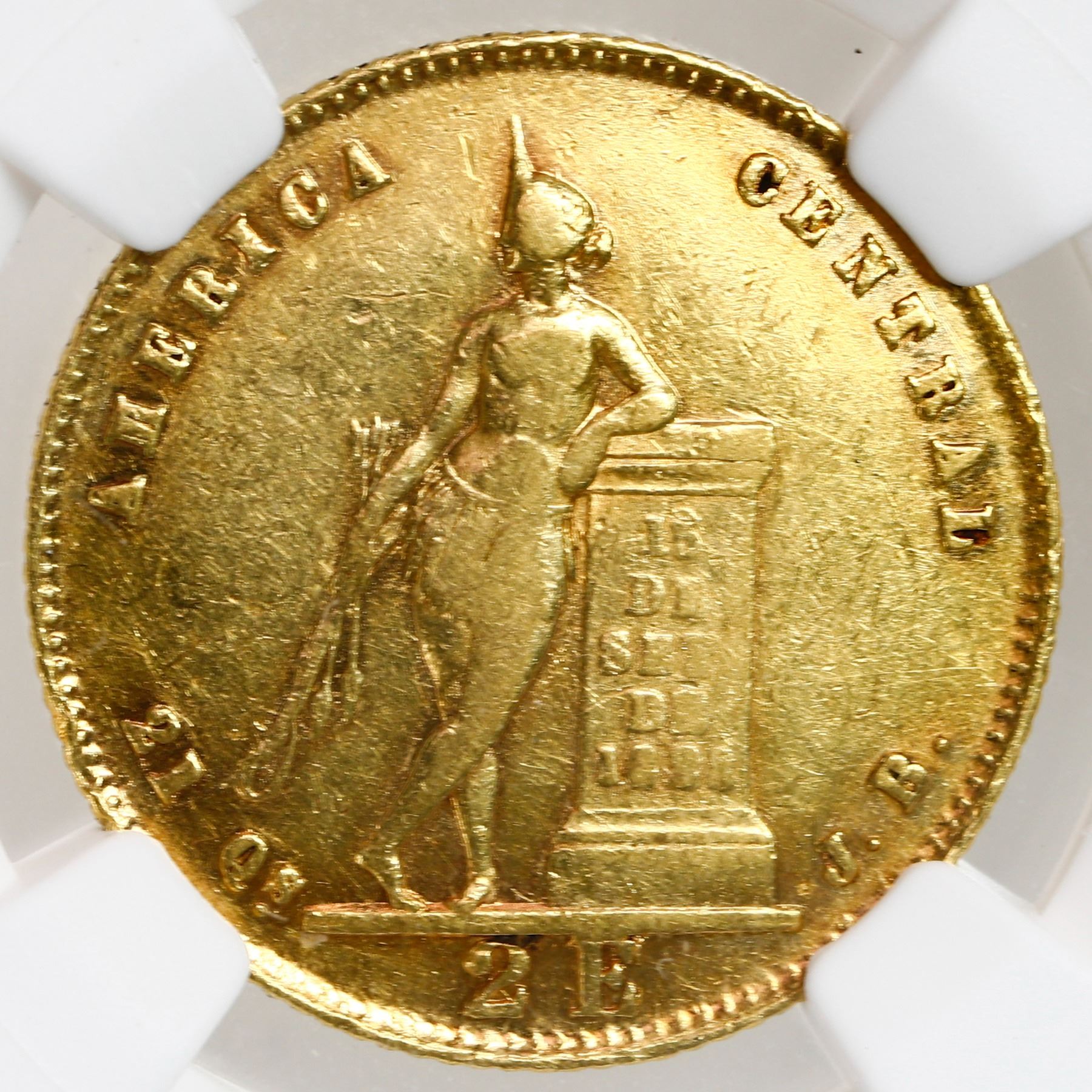 Costa Rica, gold 2 escudos, 1855 JB, NGC AU details / cleaned. KM-99; Fr-8. 6.22 grams. Desirable piece despite light cleaning with ample luster and plenty of detail, particularly on the arms side. Please use this link to verify the certification number