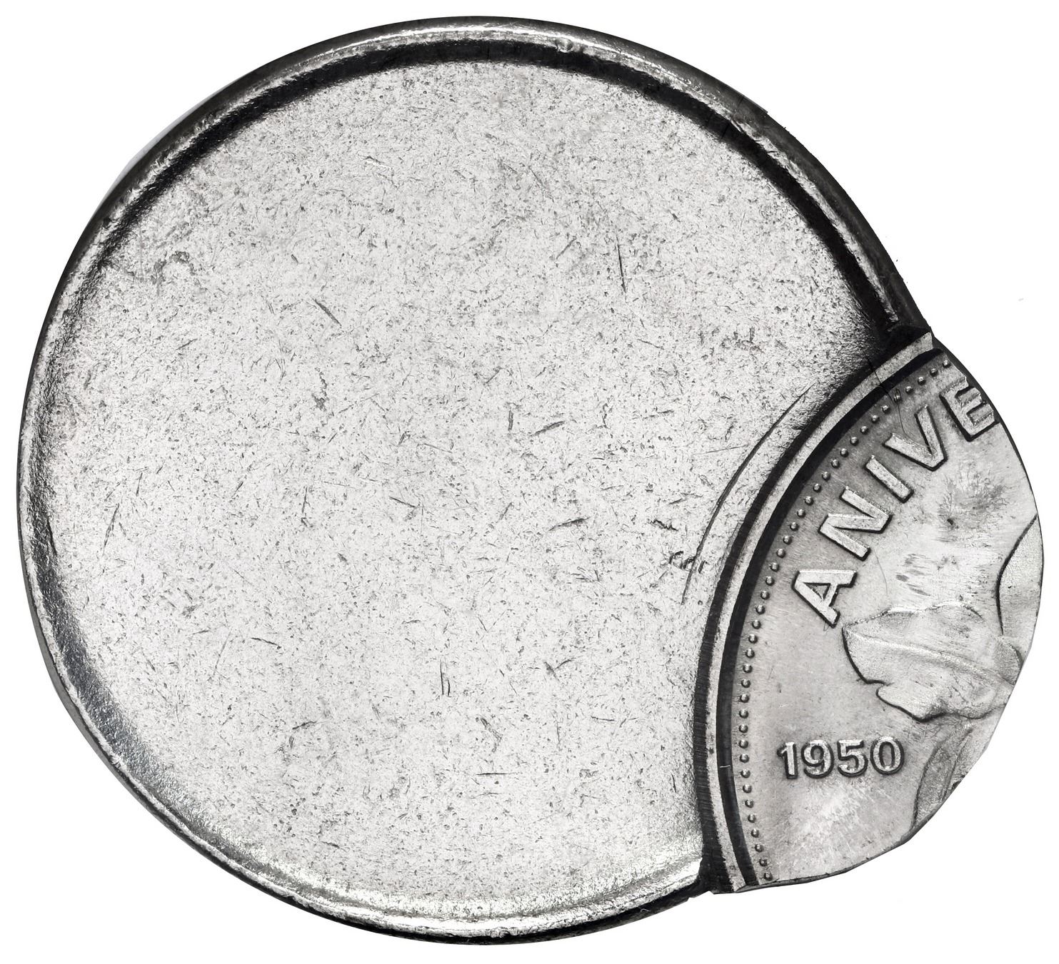 Costa Rica, nickel 20 colones, 1975, 25th anniversary of the Central Bank, struck 75% off-center, NGC Mint Error MS 65. KM-205. Just about as much off-center as you can get while still showing a full date, lustrous and choice, great for showing what a blank flan looks like. NGC #1527016-012. Pedigreed to the Tamarindo Collection of Costa Rican Error Coins.