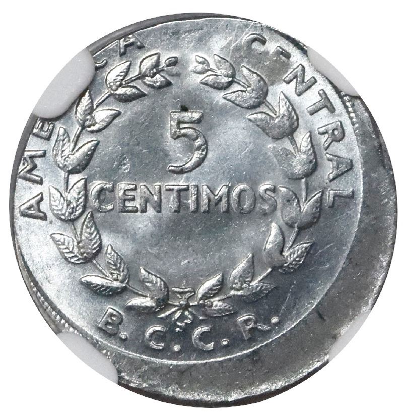 Costa Rica, stainless steel 5 centimos, 1967 BCCR, NGC Mint Error MS 64, struck 10% off center. KM-184.1a. Nice luster and faint blue color, nearly full details despite the improper centering. NGC #4735710-010. Pedigreed to the Tamarindo Collection of Costa Rican Error Coins and Paper Money.