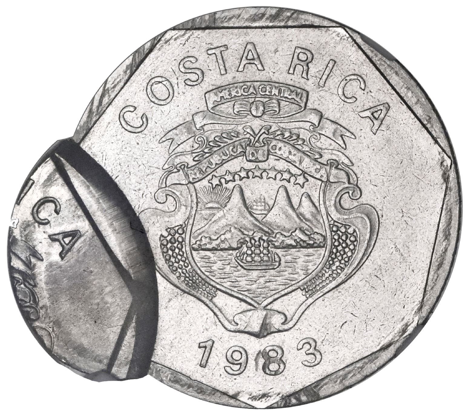 Costa Rica, stainless steel 5 colones, 1983 BCCR, NGC Mint Error MS 64, double struck, 2nd strike off center. KM-214.1. Good luster but slightly grainy surfaces per the issue, the greatly offset double-strike protruding from the edge and disrupting the artistic effect of an octagonal design on a round planchet. NGC #4735693-022. Pedigreed to the Tamarindo Collection of Costa Rican Error Coins and Paper Money.