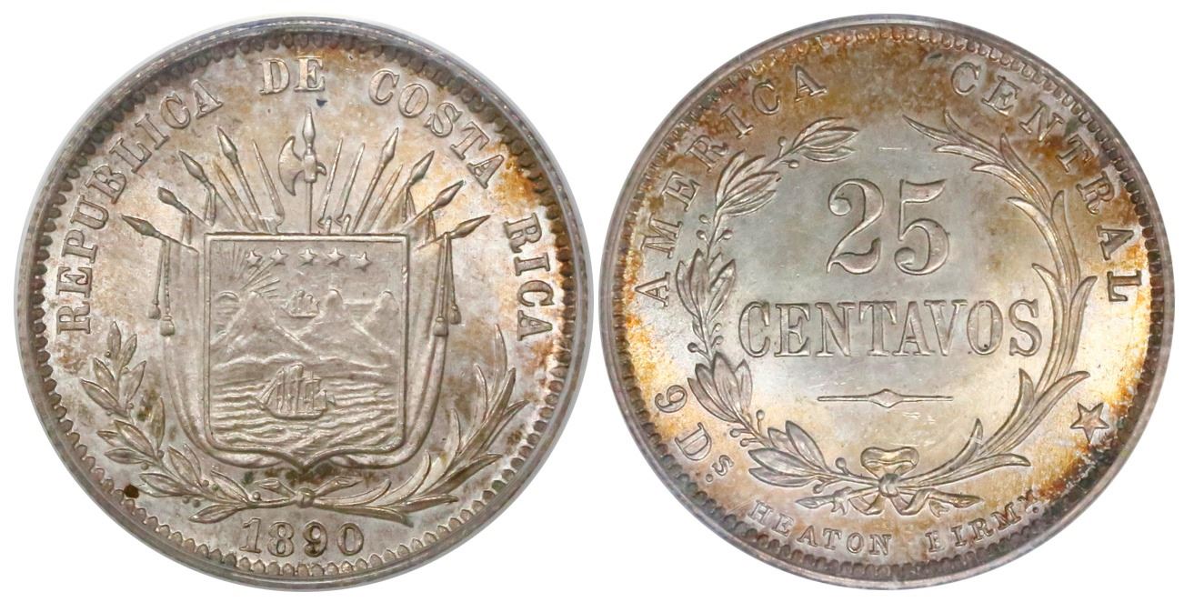 Costa Rica (struck in Birmingham, England), 25 centavos, 1890-HEATON BIRMM, PCGS MS65, finest known