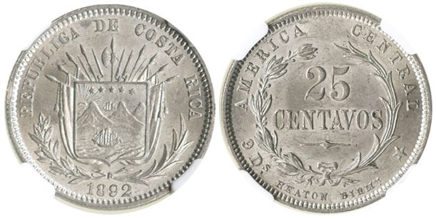 Costa Rica (struck in Birmingham, England), 25 centavos, 1892-HEATON-BIRMM, encapsulated NGC MS 63. KM-130. Nice luster and choice strike, in fact the second finest known specimen graded by NGC, just not quite lustrous enough for 64.