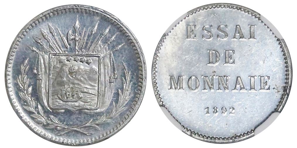 Costa Rica (struck in France), aluminum piefort essai 1 centavo, 1892, rare, NGC MS 63, ex-Richard Stuart (stated on label), finest and only example in NGC census. KM-unl. Frosty and bright, with choice details and luster on arms side, the other side (with ESSAI / DE / MONNAIE / 1892) showing light marks in the open field. KM lists this piefort in copper, nickel and bronze, but not in aluminum as seen here. Pedigreed to the Richard Stuart collection. NGC #4425833-007.