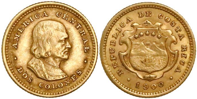 Costa Rica (struck in Philadelphia), 2 colones, 1900.