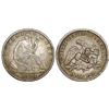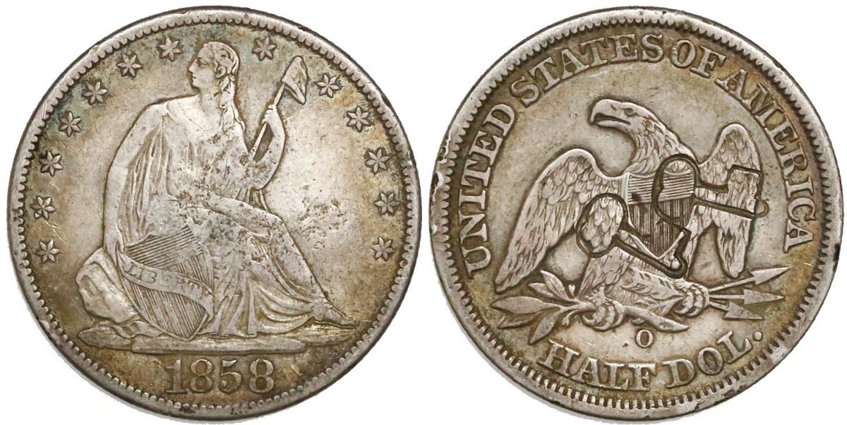 Cuba, 50 centavos, double short-and-thick key countermarks (1872-77) on a USA (New Orleans) seated Liberty half dollar 1858-O, rare. KM-R5.3. 12.31 grams. Rare with two countermarks, both on reverse, both VF and nearly full, on a lightly rainbow-toned XF host (rare grade for a countermarked issue) with minor rim-bruises and some marks in the center of the obverse from countermarking.