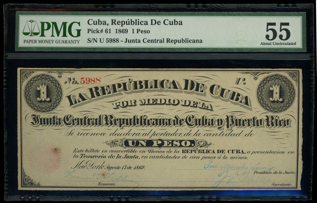 Cuba, Junta Central Republicana de Cuba y Puerto Rico, 1 peso, 1869, serial U 5988, PMG AU 55, ex-EMO collection. SCWPM-61. Nicely framed and lightly handled example of this Ten Years' War note issued in New York City as a means of raising funds for the independence forces led by Cespedes. Pedigreed to the EMO collection (stated on the label).