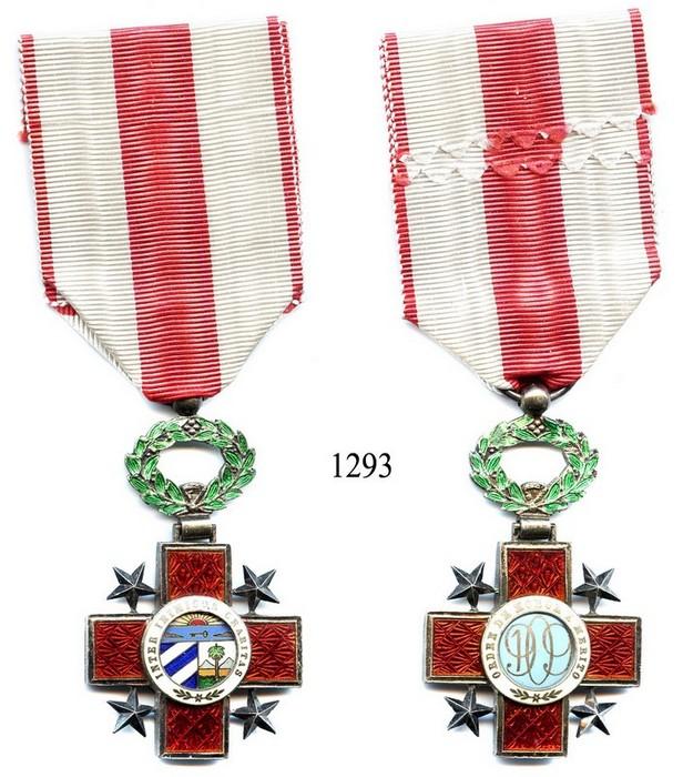 Cuba, decoration for the Order of the Honor and Merit of Cuba, 1909. 17.3 grams. Beautiful cross-shaped enameled pendant and red-and-white ribbon, with ORDEN DE HONOR Y MERITO printed in the white enamel around light blue center that bears the 1909 date, INTER INIMICOS CHARITAS printed in the white enamel around a multi-color seal on the reverse, the cross background all red with green wreath above, choice condition.