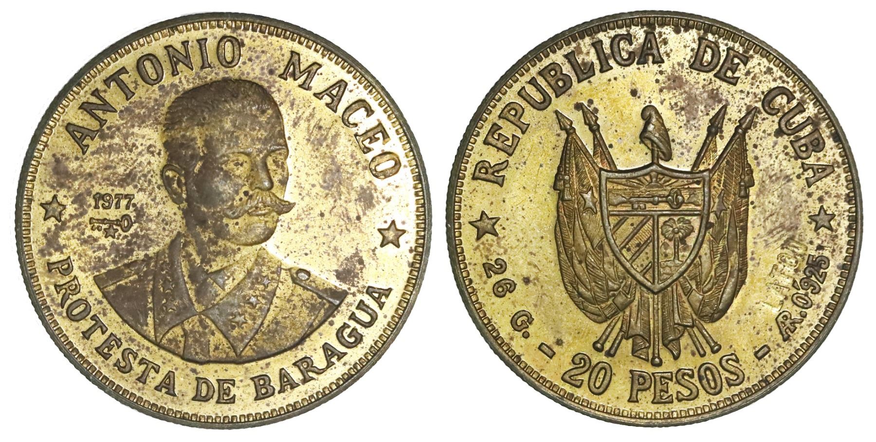 Cuba, off-metal pattern for silver 20 pesos in brass, 1977, Antonio Maceo, rare, ex-Rudman. KM-TS1. 17.48 grams. Mint State with mostly original brass color and luster but with some dull and spotty areas, desirable as among the first coin strikings from the Havana mint. Pedigreed to the Isaac Rudman numismatic cabinet.