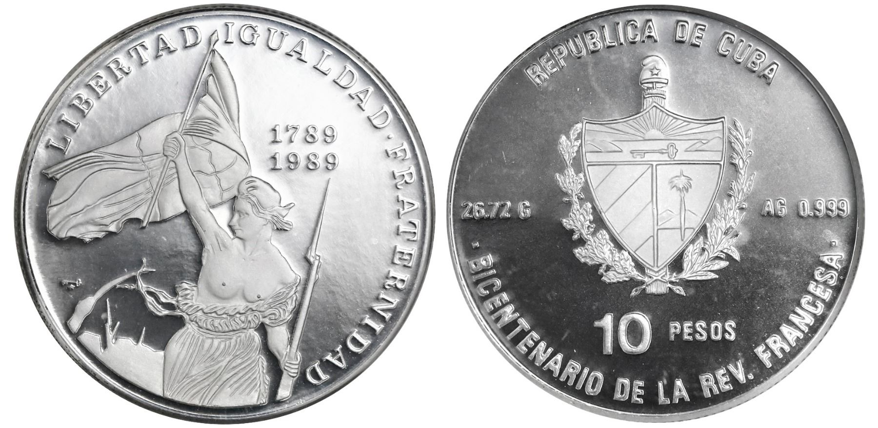 Cuba, proof piefort 10 pesos, 1989, French Revolution anniversary / Lady Liberty, NGC PF 67 Ultra Cameo, ex-EMO Collection (stated on label). KM-P16. Obverse design based on Eugene Delacroix's "Liberty Leading the People." Bright proof with only a few spots of haze, fully untoned. Pedigreed to the EMO Numismatic Cabinet. NGC #3911283-004.