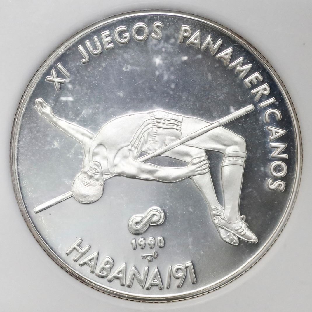 Cuba, proof piefort 10 pesos, 1990+1991 Pan-American Games Havana / High Jump, NGC PF 67 Ultra Cameo. KM-P37. Bright, untoned proof in thick NGC holder. NGC #4503123-004.