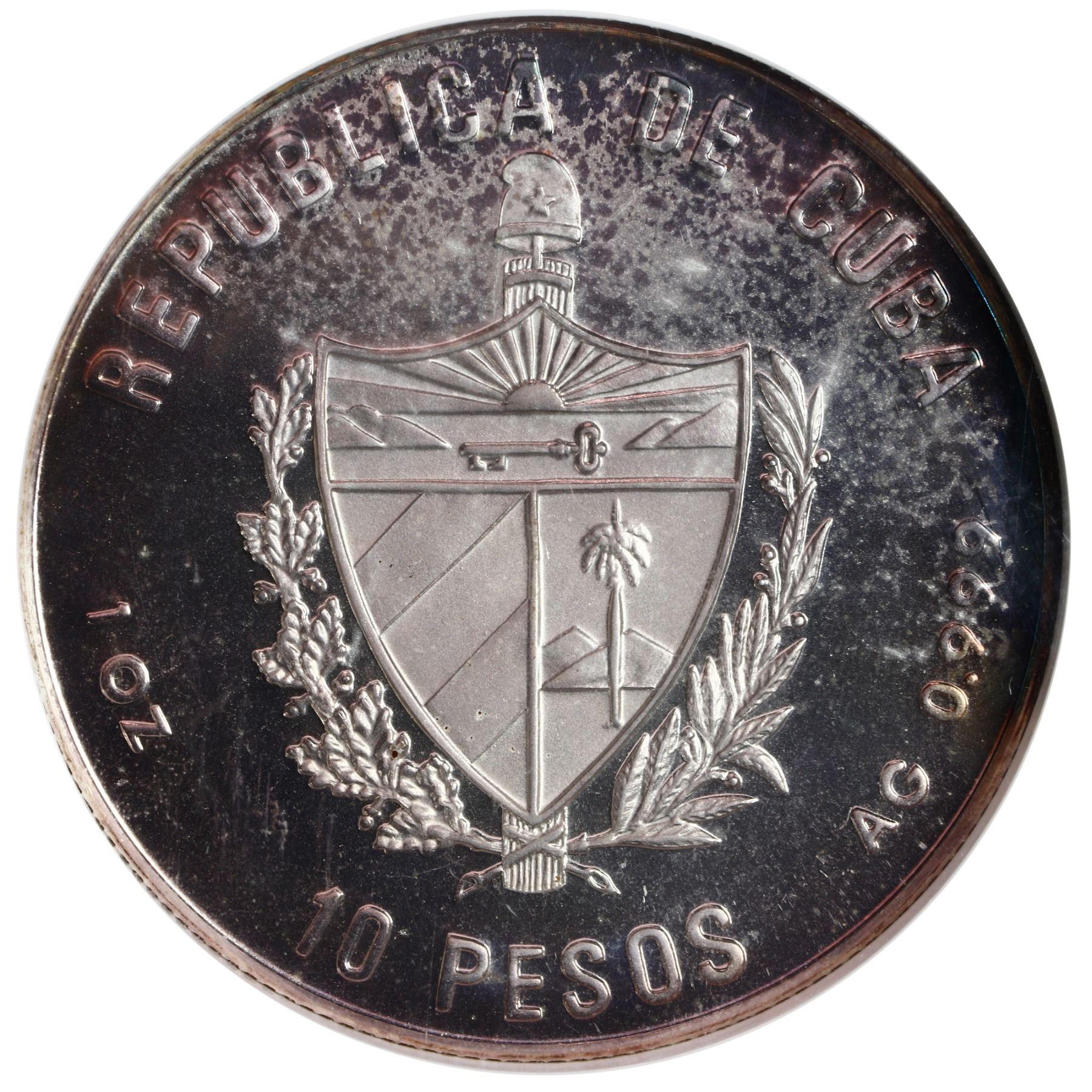 Cuba, silver proof piefort 10 pesos, 1990, Eleventh Pan American Games (Havana, 1991) - Baseball, NGC PF 66 Cameo. KM-P39. Bright proof surfaces with deep blue toning around the edges. Please use this link to verify the certification number
