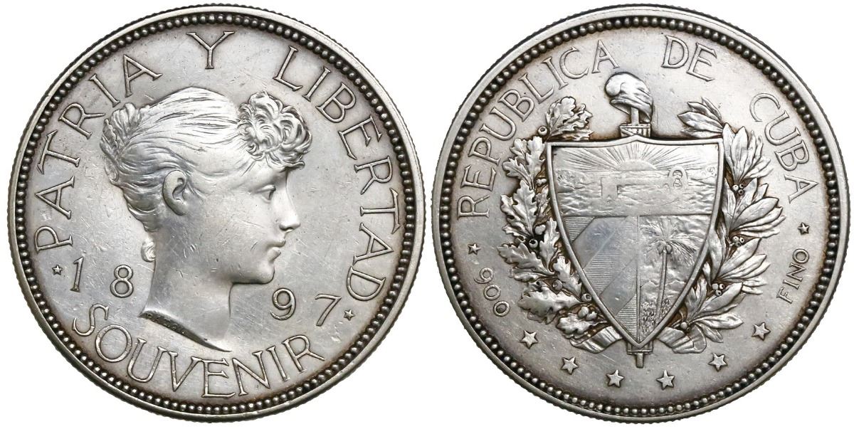 Cuba,  souvenir  peso, 1897, wide date, PAT.97. on neck truncation.
