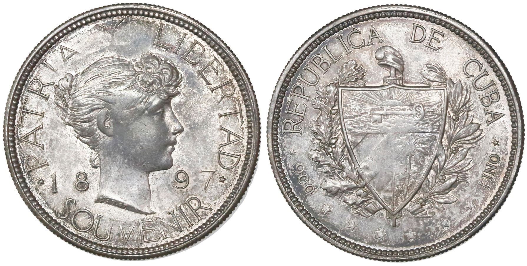 Cuba, "souvenir" peso, 1897, wide date, PAT.97 on neck truncation. KM-XM1. 22.40 grams. Lustrous AU with high-relief centers somewhat weak (as made), bluish toning, attractive and popular.