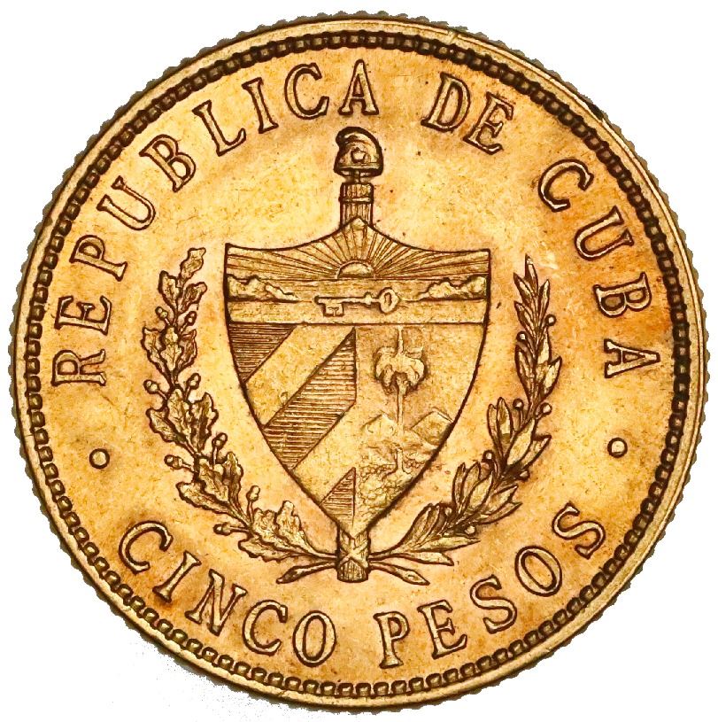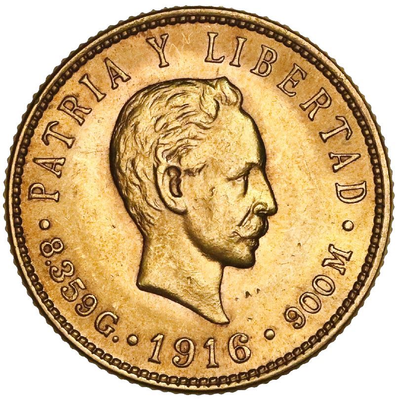 Cuba (struck at the Philadelphia Mint), gold 5 pesos, 1916, Jose Marti, NGC MS 62. KM-19. Nice luster with light rosy toning throughout, not many bagmarks but a few in obverse field slightly deep. NGC #5939651-009.