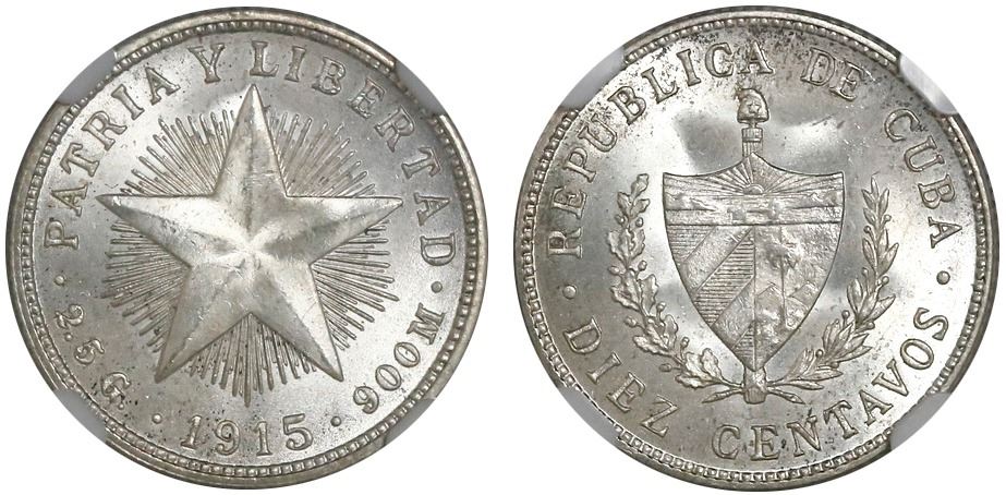 Cuba (struck at the Philadelphia mint), 10 centavos, 1915, NGC MS 65, ex-EMO Collection (stated on