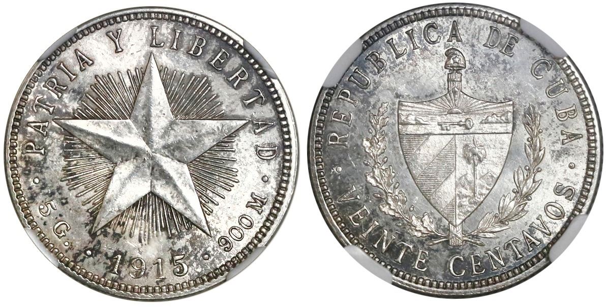 Cuba (struck at the Philadelphia mint), 20 centavos, 1915,  low-relief star, coarse reeding, NGC MS