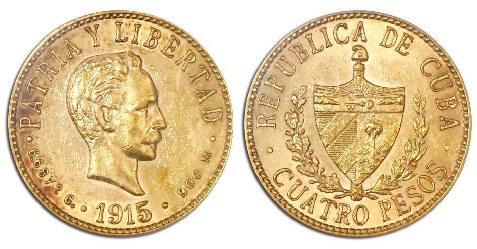 Cuba (struck at the Philadelphia mint), 4 pesos, 1915, PCGS AU55. KM-18. Rich gold color with spots of red in legends, minor bagmarks and muted luster but practically no wear. PCGS #5524847.