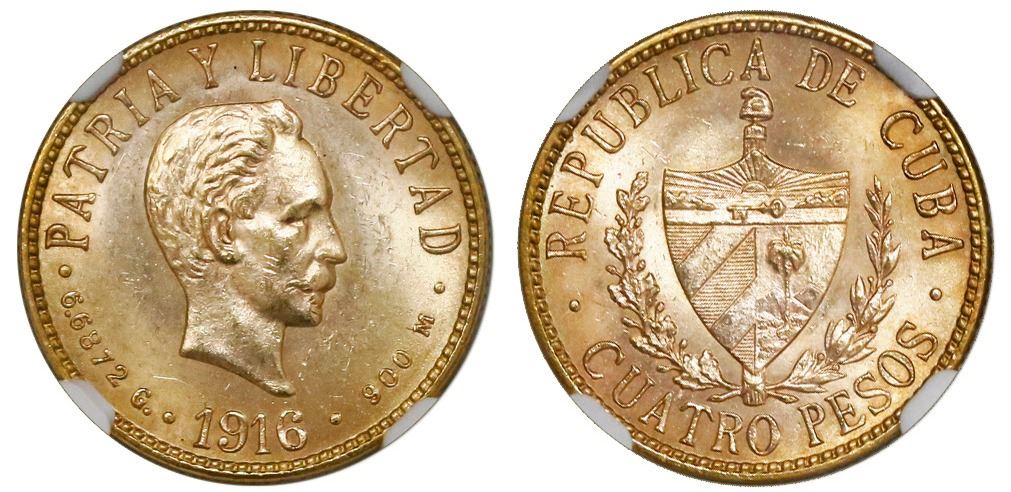 Cuba (struck at the Philadelphia mint), 4 pesos, 1916, NGC MS 64.