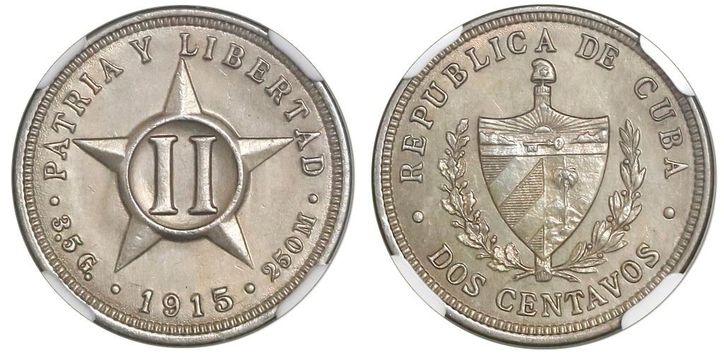 Cuba (struck at the Philadelphia mint), copper-nickel 2 centavos, 1915, NGC MS 65, ex-EMO Collection