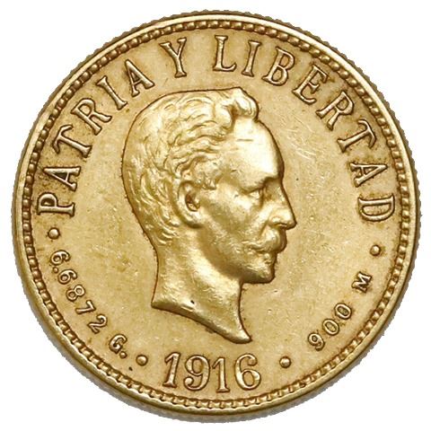 Cuba (struck at the Philadelphia mint), gold 4 pesos, 1916. KM-18. 6.69 grams. XF/AU with light surface marks.