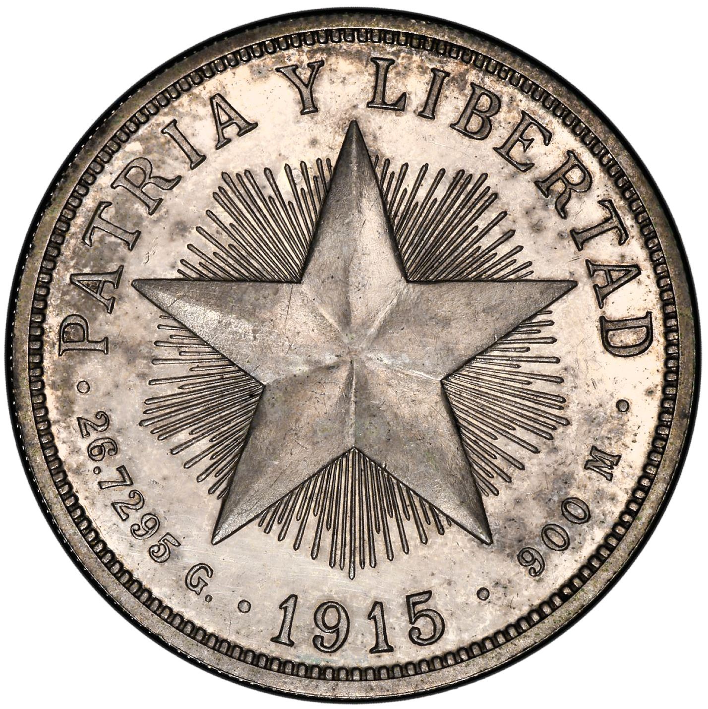 Cuba (struck at the Philadelphia mint), proof 1 peso, 1915, high relief star, rare, PCGS PR62.