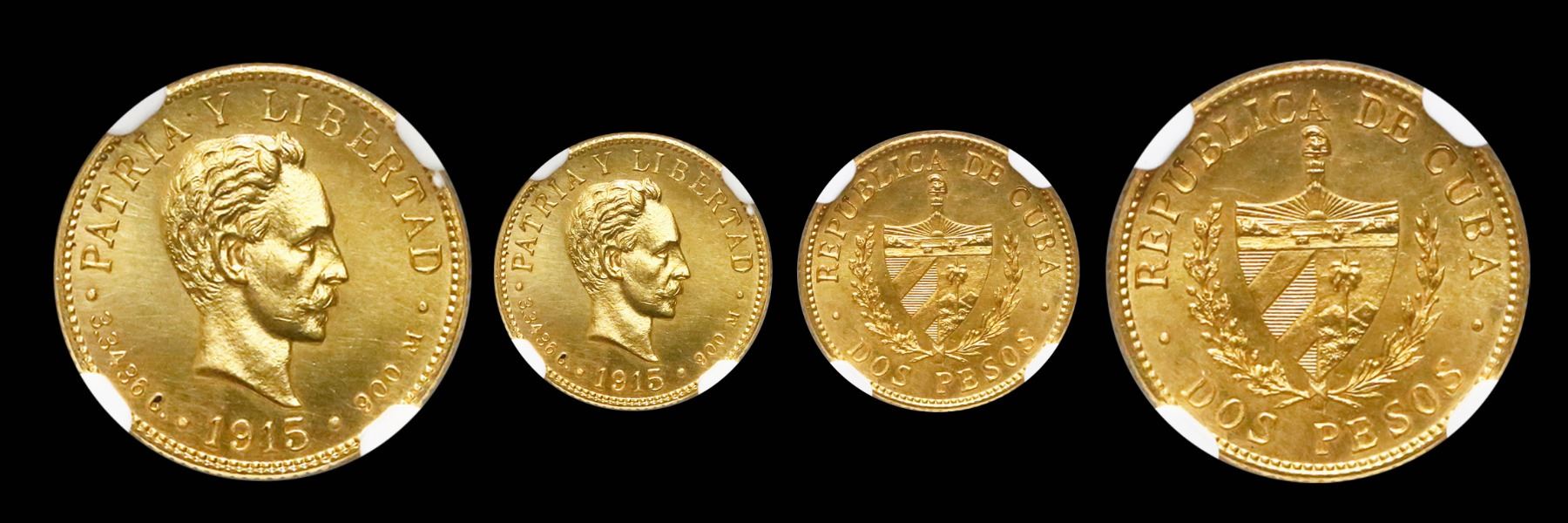 Cuba (struck at the Philadelphia mint), specimen 2 pesos, 1915, unique, NGC SP 66, finest and only known in NGC and PCGS censuses. KM-17; Fr-6. Lustrous and specially struck, with no marks or problems at all. NGC #4499455-002.